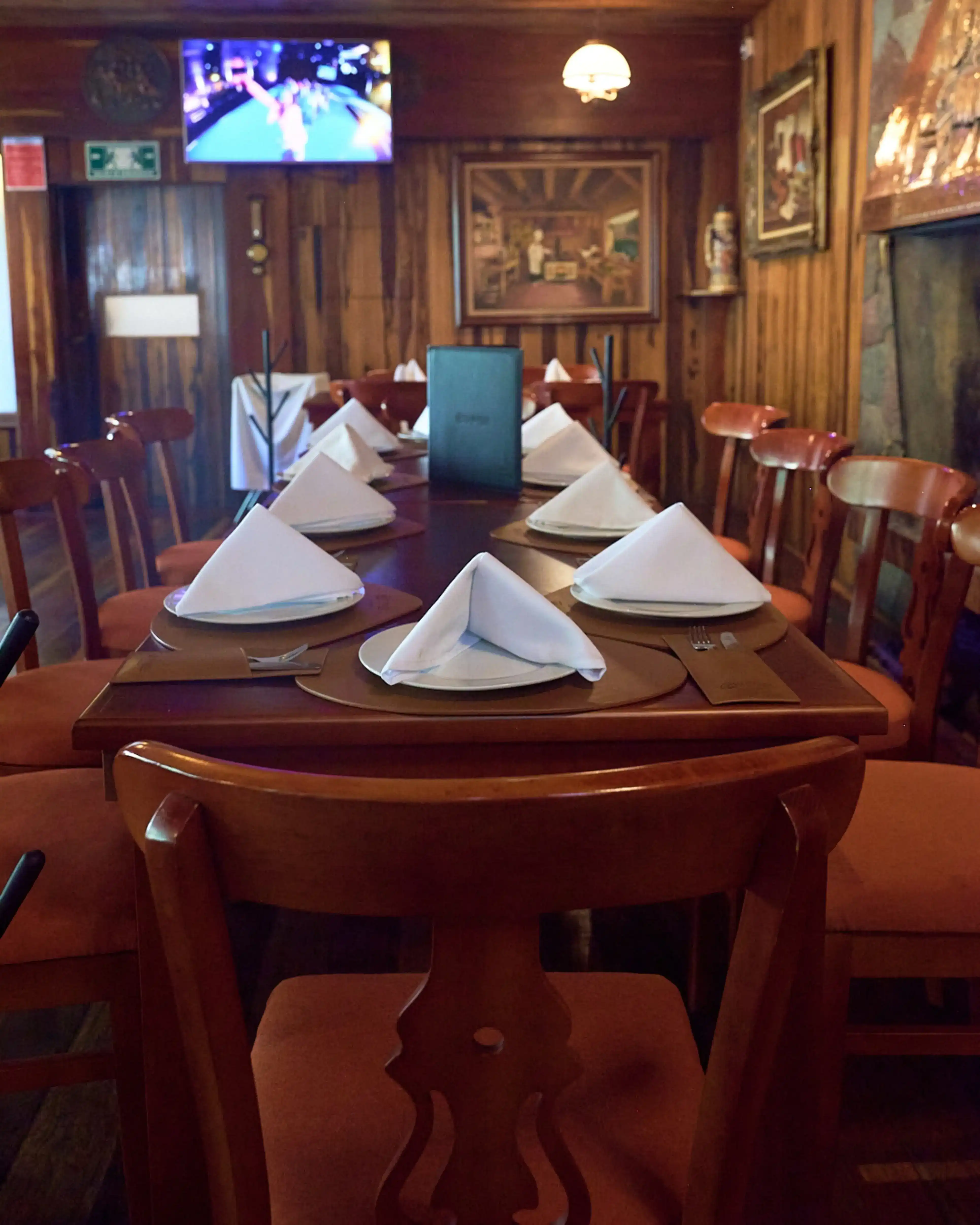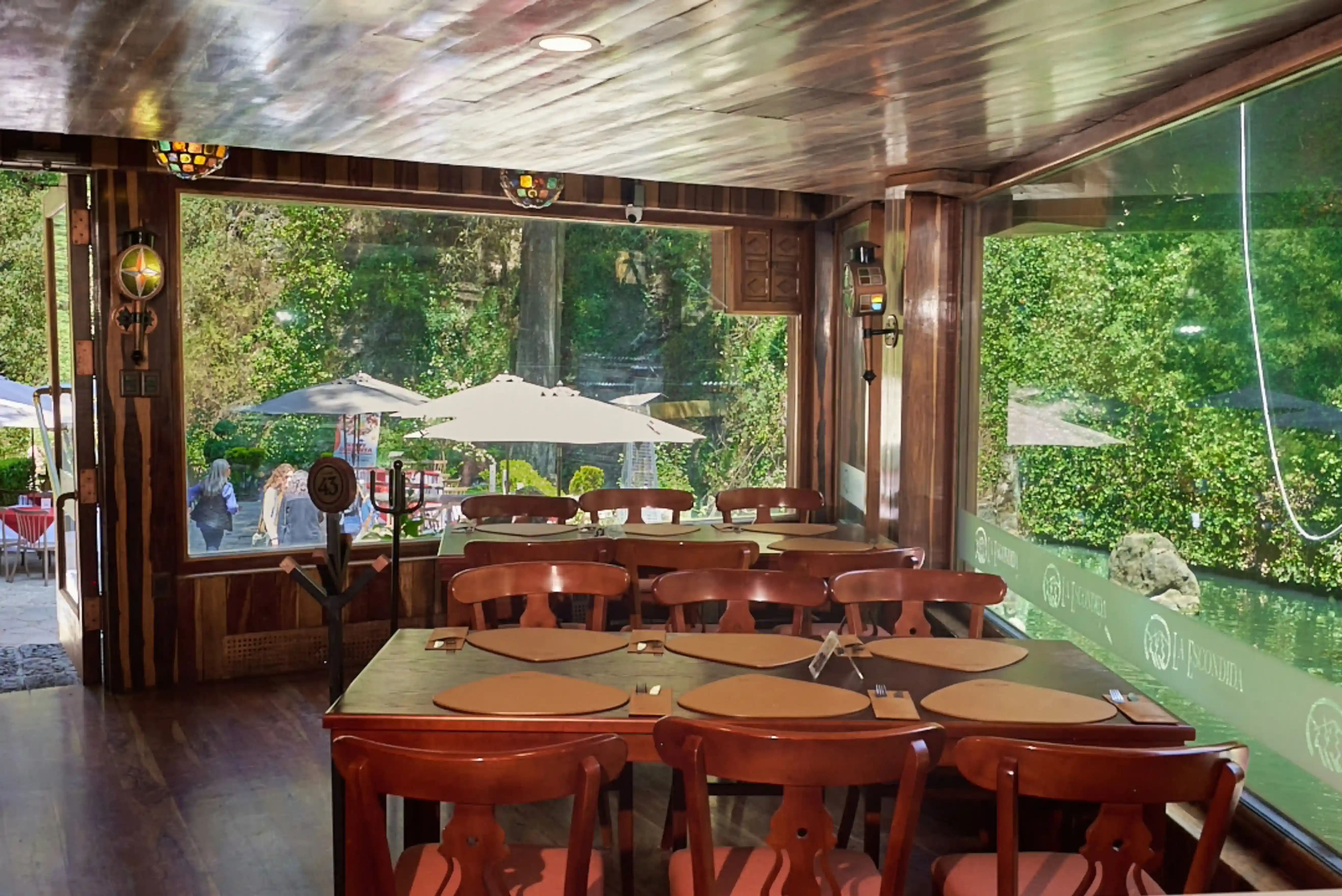 Fundado en 1959 por Eduardo de Nicolás, comenzó con una sola cabaña y se expandió con salones como Armas, Terraza y Mirador. Hoy cuenta con espacios para eventos, jardines y una variada carta gastronómica que incluye especialidades como cabrito, conejo, lechón, trucha, fondue y carnes al carbón.